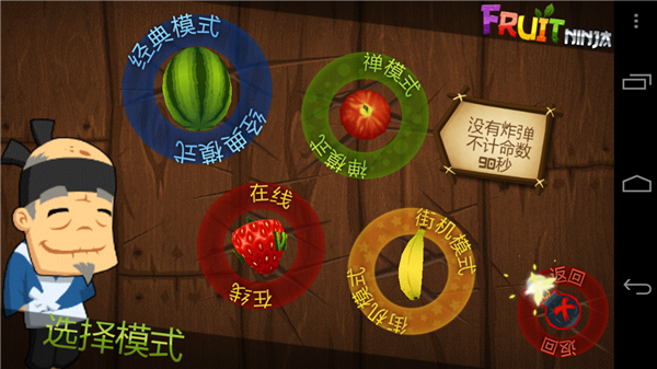 Arcade:图标是香蕉的街机模式,也是花样最多的模式。时间只有60秒,水果和炸弹一起上。切到炸弹会扣分但游戏不会结束。这个模式的关键就是利用好三种特殊香蕉:红黄色的狂热香蕉、蓝白色的冰冻香蕉、还有蓝黄色的双倍计分香蕉。玩明白了这三种香蕉,你就是街机大神。