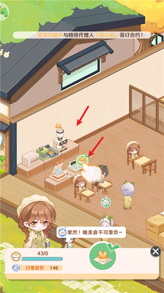 游戏前期包含剧情引导,完成后即可进入正式经营流程。顾客到店后会显示点单提示,点击即可查看需求并开始制作。