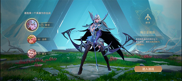 2、进游戏第一件事,就是选英雄。新手教程会给你射手、战士、法师三个选项,咱们先选个射手试试水,然后点进入游戏。