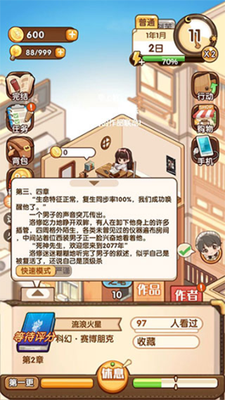 小说家模拟2是一款模拟经营类游戏,扮演一个普通小作者,一边顾生活一边追梦想开始慢慢写小说,刚开始可能还住在小房间里,每天靠写稿赚钱,慢慢把作品签约、发表,再一步步做到出实体书、卖版权,甚至拍成电视剧和电影,日常可以去也可以自由安排,比如休息、出门走走、玩手机、照顾小狗或者去上课提升能力,很多选择都会影响后面的发展,玩起来像在体验一个完全不一样的人生。