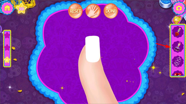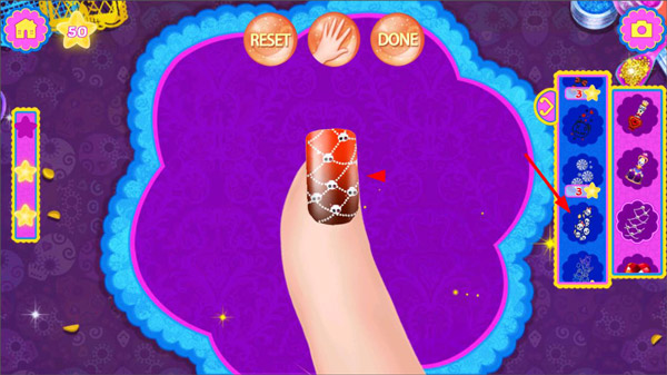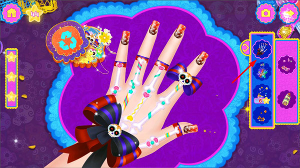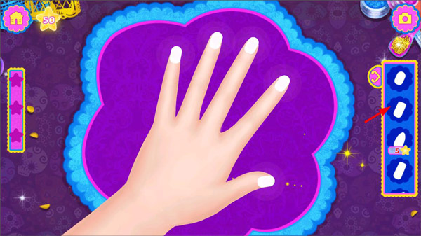 4、基础颜色涂完,就可以加点装饰了。工具栏里有不少小玩意儿,可以给指甲上贴点东西,让它看起来不那么单调。