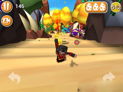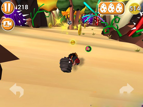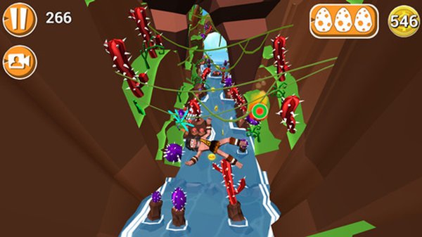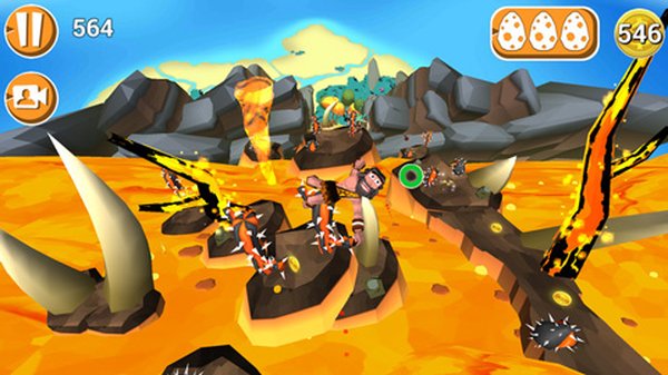 3、游戏里挂掉的方式有好几种:撞上仙人掌、滚出赛道、掉进岩浆或者跑太慢被岩浆追上,还有就是碰到漩涡之类的必死陷阱。不过撞到树、石头或者草丛这些倒是没事,只会让你减速。