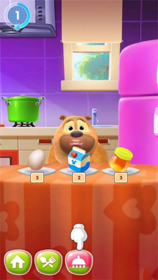 1、开局先让你选个崽,进了主界面之后,注意看屏幕下方的状态图标。要是熊饿了,就点那个吃饭的图标,然后把桌上的食物划拉到它嘴边就行。看,就是下面截图这样。