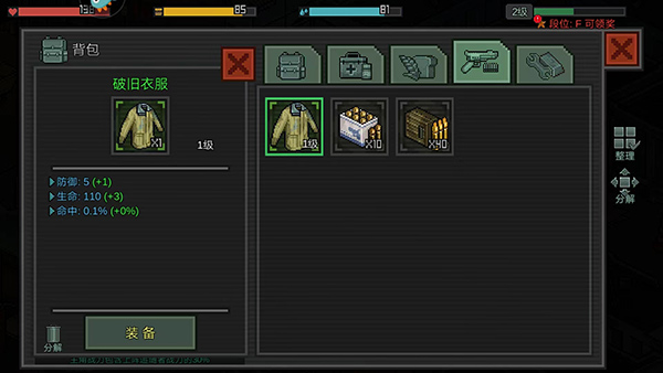 7、左下角有个【背包】,点开能看你捡了啥破烂,也能在这儿吃药、换装备、装填子弹。