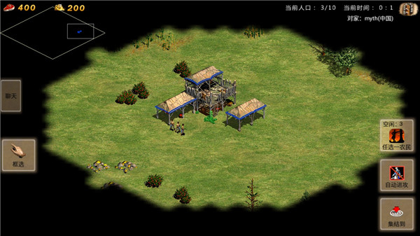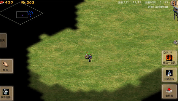 3、进了游戏,你可以一个个点农民,嫌麻烦就点那个框选按钮,直接拉个框把一堆农民都选中。
