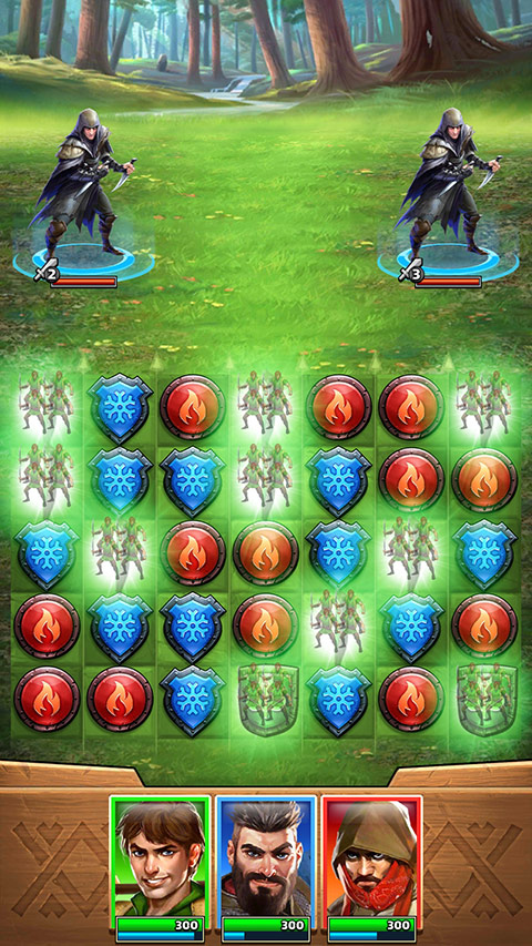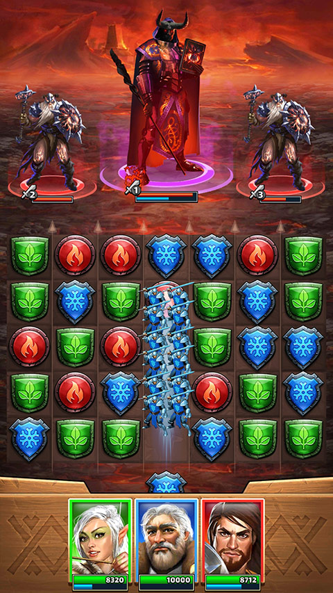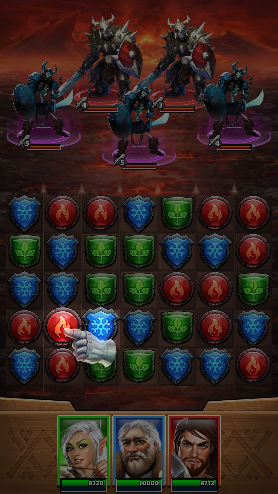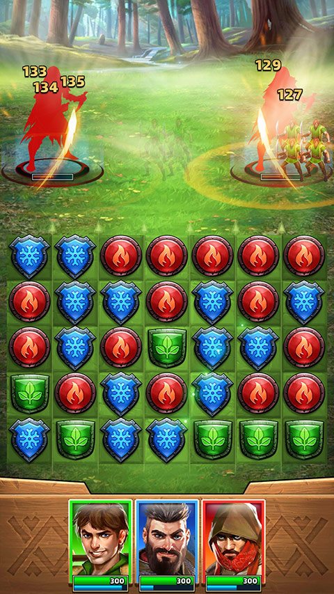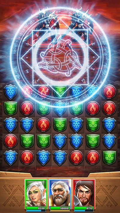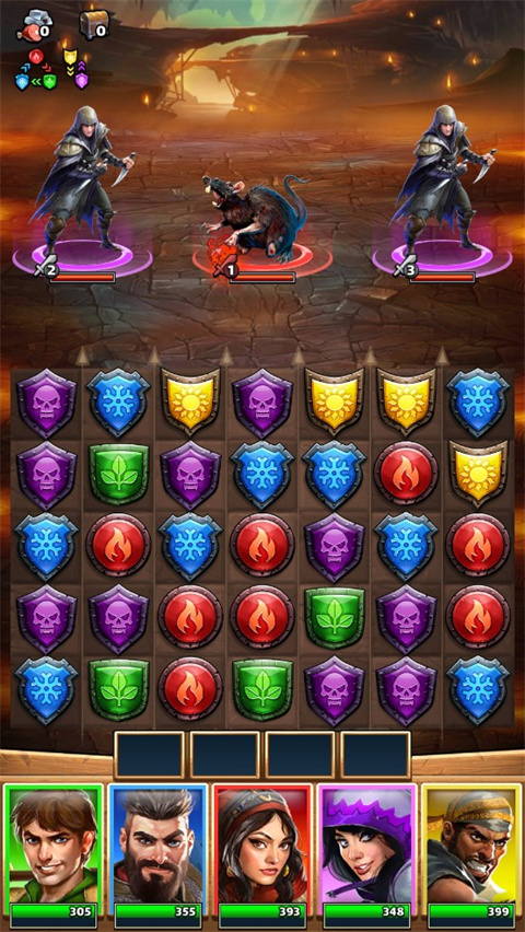 4、玩法核心就是消除,把一样的图案划拉到一块儿就能消掉,然后你屏幕上方的英雄就会自动攻击敌人。