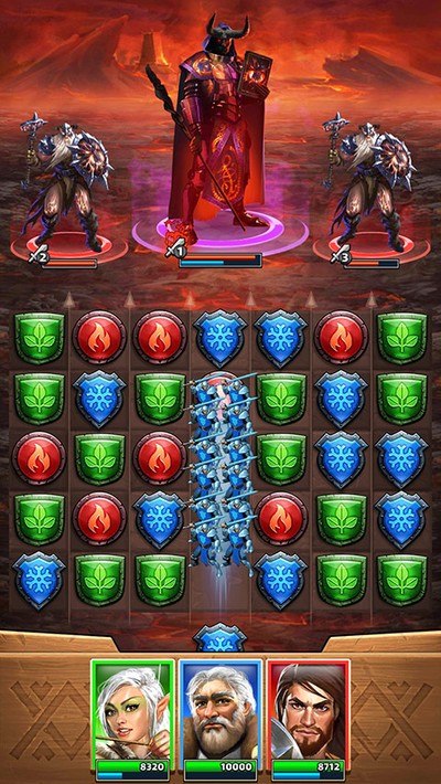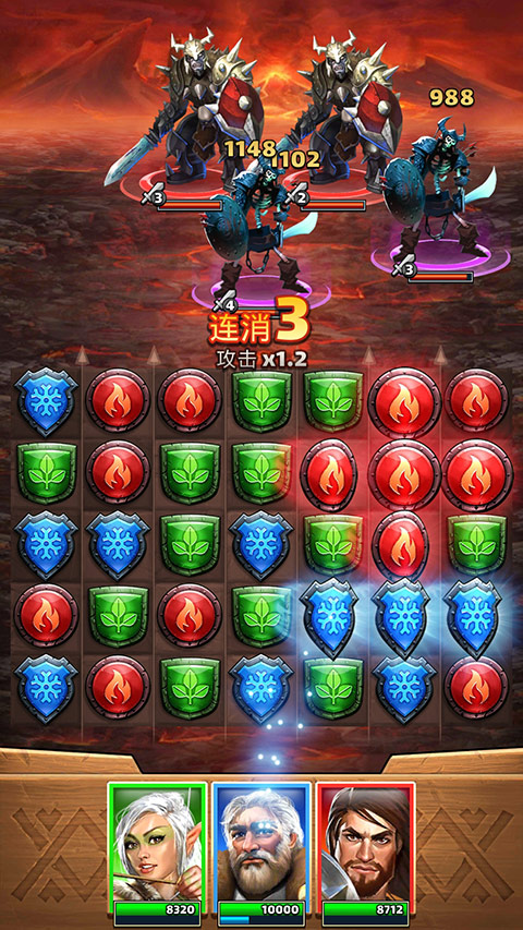 这游戏的战斗模式有点像回合制,但在你行动的时候,可以通过三消来增加伤害。打boss的时候这玩意儿特别关键,得多练练。讲真,这三消难度不算高,稍微琢磨一下,连击什么的信手拈来。