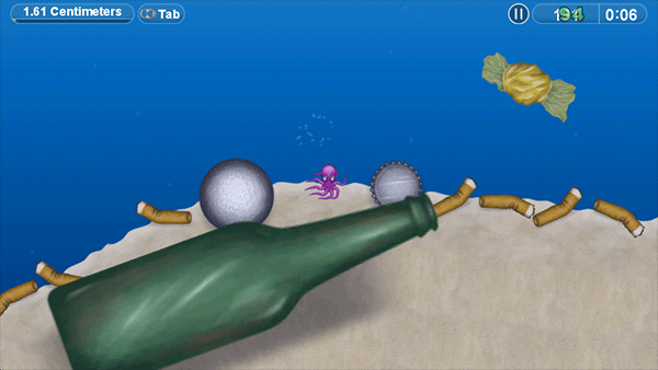 4、进游戏后就控制你的小章鱼到处吃垃圾就行。记住,通关时间越短,最后给的评价就越高。