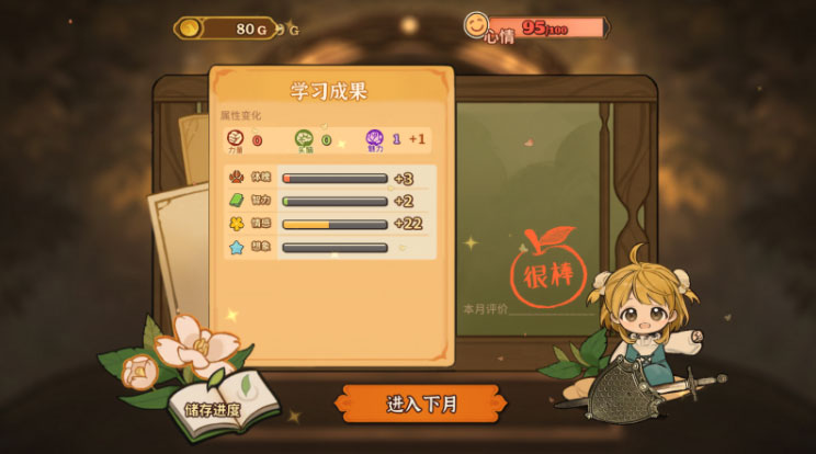 6、执行日程后,角色将根据完成情况获得对应属性提升。