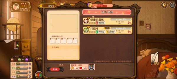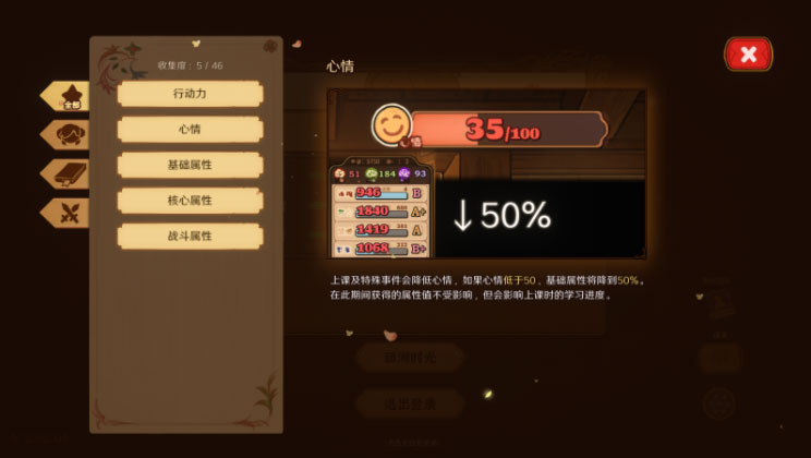 2、心情:上课或事件会影响心情,当低于50时基础属性下降至50%,影响学习效率。