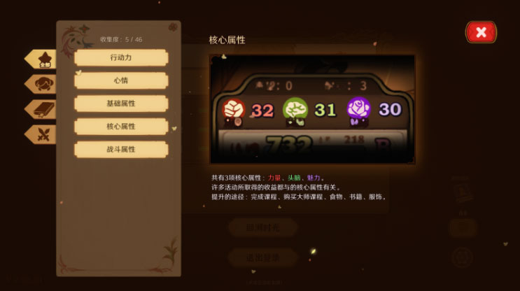 4、核心属性:包括力量、头脑、魅力,影响多数活动收益,可通过课程与道具提升。