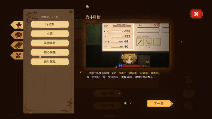 5、战斗属性:包括HP、攻击、防御、闪避与暴击,可通过升级、装备与特殊道具提升。