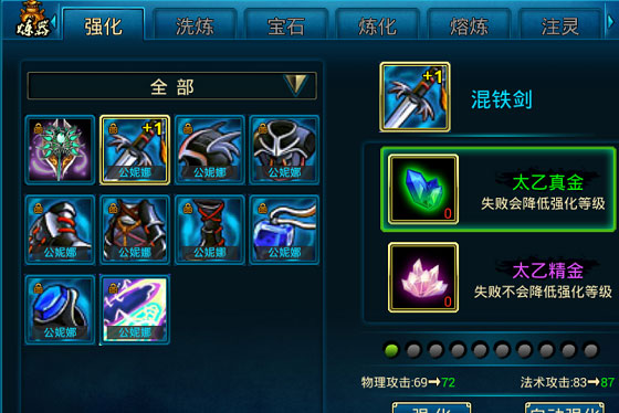 这个就是强化装备和法宝。有一说一,这里面有点坑。五行真金和太乙真金这两种材料,强化失败了会掉级。而五行精金和太乙精金失败了不掉级。所以我的建议是,装备强化到+4以后,就老老实实用精金吧,不然掉一级能心疼死。