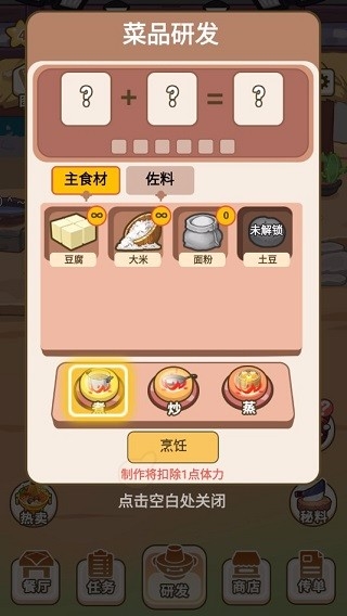 2、菜品研发系统相当丰富,从地道的街边小吃到精致的宴会料理,可以说是应有尽有。通过不断解锁新菜单,你可以逐步提升餐厅的档次,吸引口味更刁钻的食客。