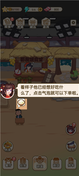 7、看到顾客头顶冒出的气泡了吗?点击它就能帮客人下单了,这可是很考验手速的哦。另外,餐厅的环境卫生也要时刻保持干净整洁才行~