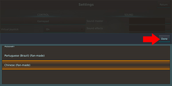 3、在列表里找到“Chinese”选中,然后点右上角的“Done”按钮保存。注意,保存后要彻底关掉游戏再重开,中文才会生效。