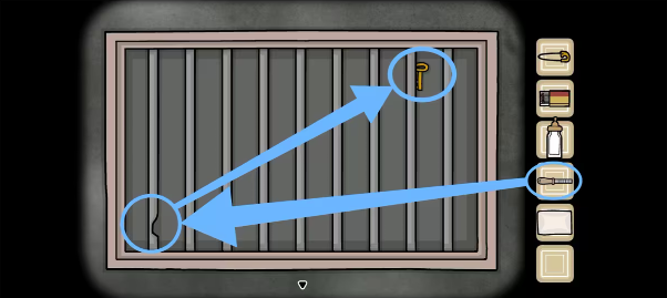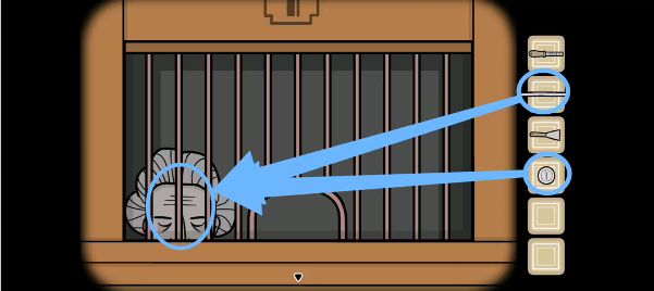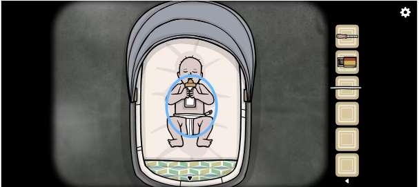 2、用锉刀割断下水道的「铁杆」,再用其拨动并拿到「钥匙」,接着回来,先将布放在婴儿的屁股下面,再用别针组成尿布,然后喂奶瓶并喝完后获得「脏尿布」。