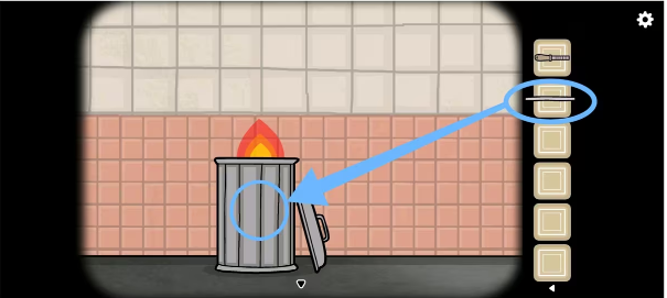 3、到车站左侧将脏尿布放入垃圾桶,用火柴点燃后再用铁杆敲碎桶身获得「刮刀」,接着用刮刀划开墙上的海报获得符号(罗斯胸口怀表的提示)。