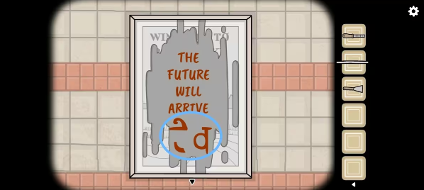 3、点击空白画框将泡泡糖粘在下方,再贴上收集到的画报,然后根据画报上的顺序(如上图)完成点击获得提示24355,接着回去将玻璃板放在电话亭上方完成拼图拿到「手摇柄」。