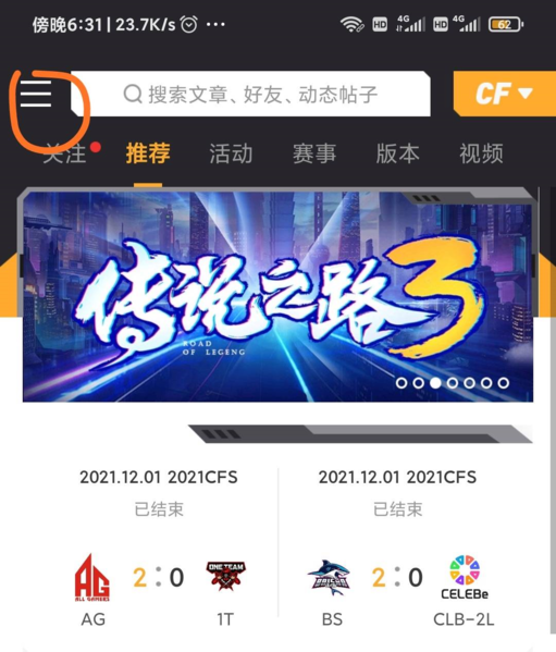 1. 打开掌上穿越火线,看App界面的左上角,有三道杠的图标,点它。