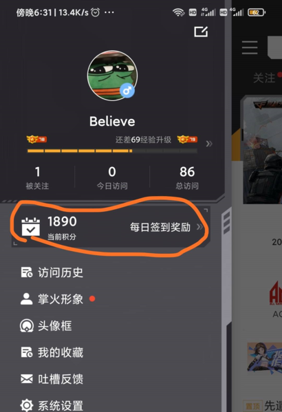 2. 点开那个三道杠之后,会弹出来一个侧边栏,直接找“签到”这两个字点一下。