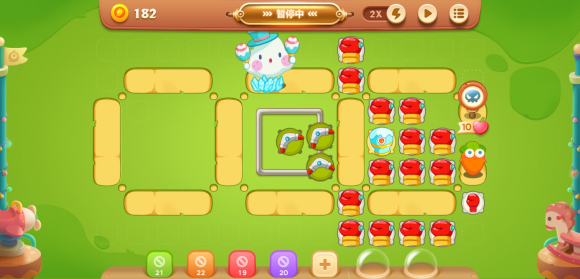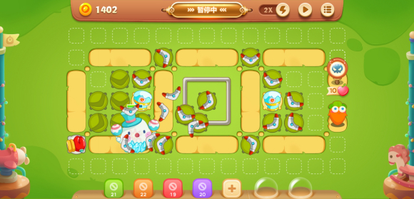 开局别想别的,先搞钱。最快的来钱方式就是清掉地图上的钱箱。卡住第一波怪的行进路线,集中火力先把左下角的钱箱给秒了。用同样的套路,把右上角的钱箱也清掉。这时候你就有足够的钱平稳度过前期了。有了钱优先把隐藏的雪球塔打出来,然后再慢慢清掉其他障碍物。