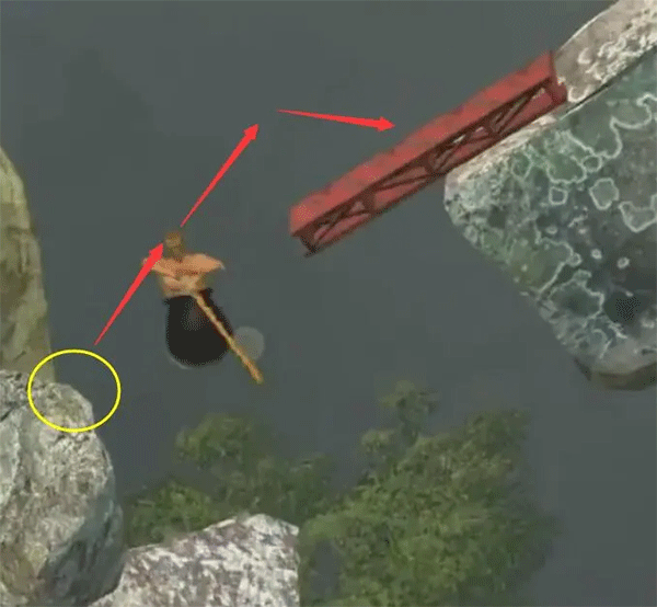 4、到这个带弓箭的地方,就是你遇到的第一个坎了。这里有两个关键点,一个是弓箭本身,另一个是旁边那块凸出来的小石头,看着不起眼,其实是关键。大家看下面这张截图。
