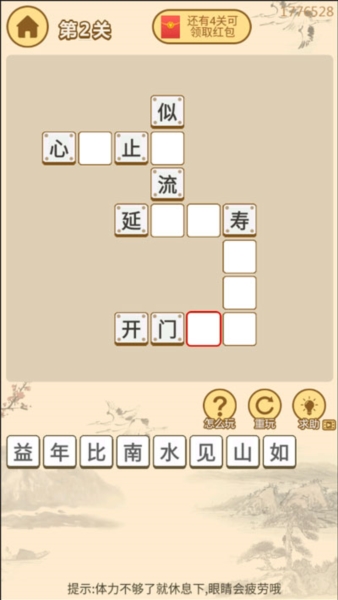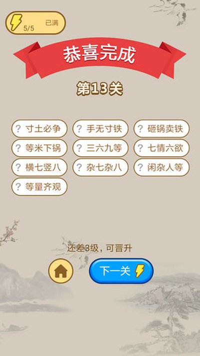 2、关卡设计还行,不是那种无脑点点点就完事儿的,得动点脑子才能把所有成语都理顺。