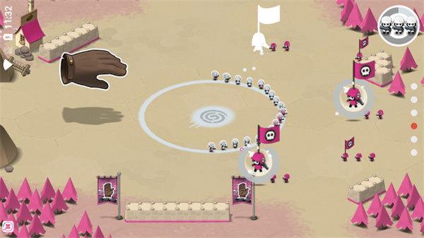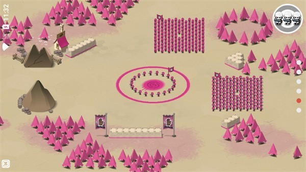 与许多同类型的即时战略游戏类似,这款游戏中也有一些你需要去争夺并占领的特殊地点,我们可以把它们叫做据点。这些据点通常是一个圆环形状的战略要地,周围一般会有其他颜色的敌方士兵把守。作为玩家,你的首要目标就是尽快干掉防守的敌人,然后占领这个据点。由于游戏采用了非常独特的颜色主题,你占领据点的过程,就像是在地图上泼洒颜料,把自己的颜色扩散开来,这种视觉上的反馈能给你带来非常直接的成就感。