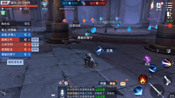 进了活动地图后,中间会随机刷新宝石,捡了就能给自家阵营加数量。干掉身上有宝石的敌人,他身上的宝石会全部爆出来。你可以看界面左边,队友和敌人的血量、宝石数量都一清二楚,点旁边的“抢夺”按钮就能自动追着他砍。