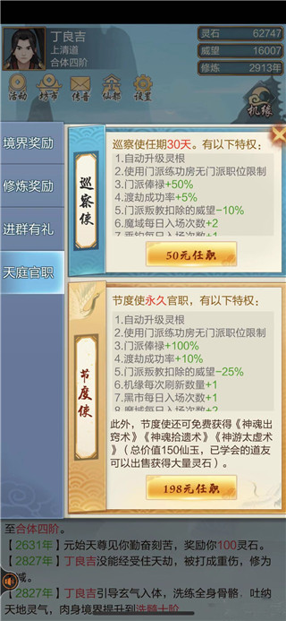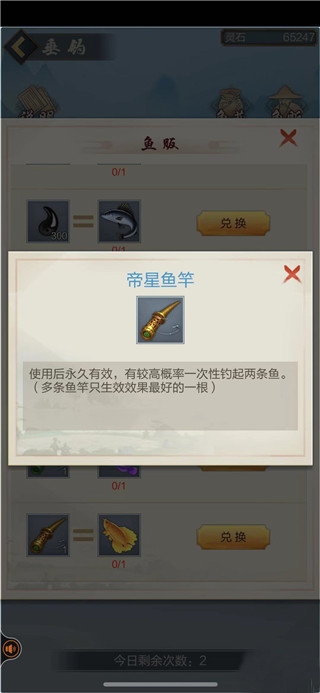 普通玩家一天就两次机会,想多钓就得想别的办法。有个法子就是去天庭买官职,像什么节度使之类的。价格嘛,有30块一个月的,也有一百九十八块永久的。官职不同,加的钓鱼次数也不同。如果你打算长玩,可以考虑搞一个,每天能多钓不少鱼。