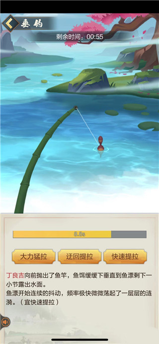 进了鱼塘你会看到有三种收杆方式:大力往上提、迂回提上来、快速收竿。必须选对方法才能把鱼弄上来。每次有鱼上钩,系统都会给你提示,你只要盯着屏幕下方的对话框就行。看到那段文字没,注意看最后括号里的建议,它让你选哪个你就点哪个,无脑操作。