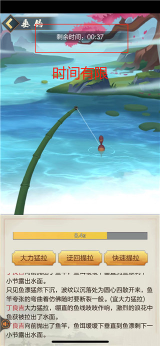 在鱼塘钓鱼是有时间限制的,手速决定了你收获多少。每一杆给你十秒反应时间,在鱼塘里总共能待六十秒。一般来说,鱼竿扔下去五六秒就有动静了,所以你得集中注意力,看到文字提示就马上选对方法,这样才能用最短的时间钓上一条鱼,在六十秒内多下几次竿,钓上来的鱼自然就多了。