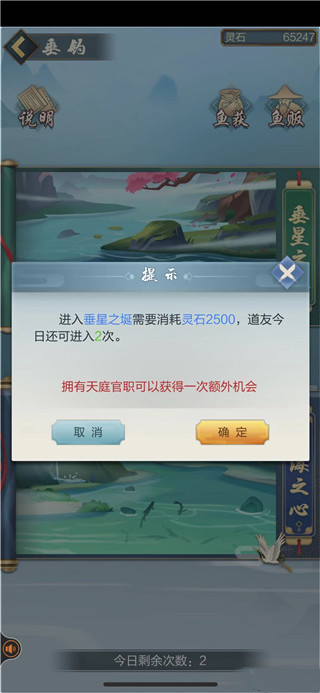 每次进鱼塘都要交“门票”,也就是灵石。最低级的鱼塘进去一次也要三千灵石。所以平时得多注意攒点灵石,洞府里的灵石生产线别忘了安排上,然后多去刷刷副本,积少成多。