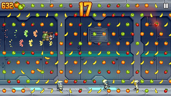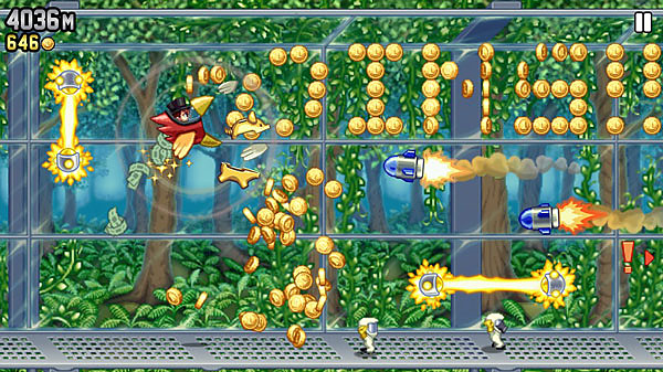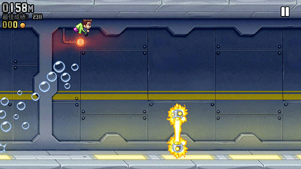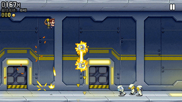 这款游戏的开发商是凭借《水果忍者》而闻名的老牌公司Halfbrick Studios。。游戏里你就是那个叫Barry的猛男,单枪匹马闯进一个到处是科学家的秘密基地。操作是真的简单,就一个手指头的事儿,点屏幕控制喷气背包的高度,一边收集路上的金币,一边捡各种奇奇怪怪的道具。当然,光吃金币可不行,你还得时刻注意那些电网、激光和导弹,碰一下就得重来。核心目标就是不断刷新自己的飞行距离,简单粗暴,但就是好玩。