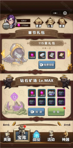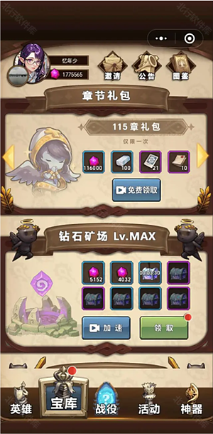 钻石矿,说白了就是个挂机收菜的地方,属于长期主义投资。前期钻石紧张,别往这里砸,优先拿去升神器,那个提升立竿见影。