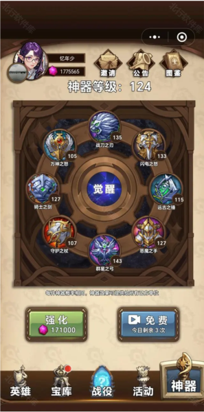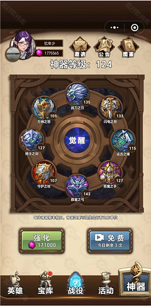 每天有3次免费强化机会,用完就得掏钻石了。每强化7次神器就能升一级,给的觉醒点数可以拿去给英雄开技能,非常重要。