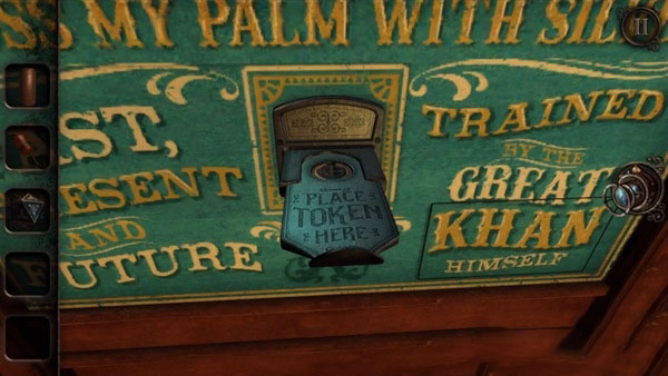 接下来的目标就很清楚了,再次进房间后,直接奔到塔罗牌游戏机那,到处点点戳戳,看有啥地方能动。接下来,请留意机器中央标有“PLACE TOKEN HERE”字样的入口,将其拉出后,第一个小机械装置即可入手。。