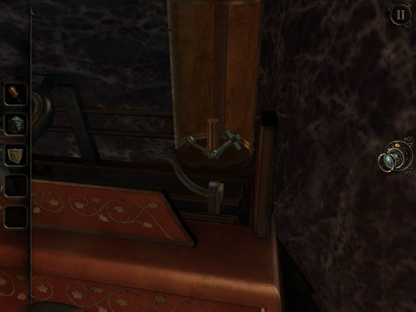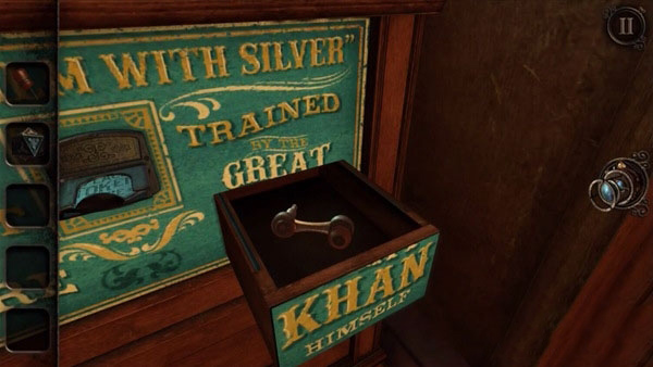 可能你一开始就注意到了,图书馆里有台标着“1795”的电话,但就是用不了。待其铃声响起,便可拨动其开关,以启动旁边的录音机。。接着你会拿到又一个手柄,回到地窖,把这个手柄安到一个有六个小柜子的木柜上,拉一下,木柜就开始运转了。