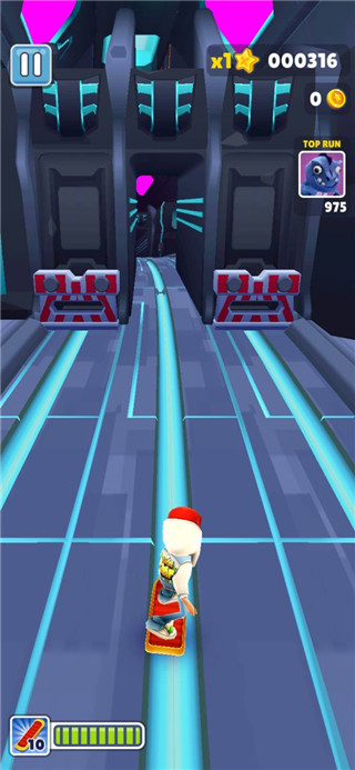 4、跑的时候快速双击屏幕,就能踩上滑板。有了滑板等于多一条命,就算不小心撞到火车也不会直接完蛋。