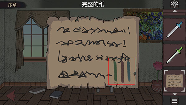 8、两张碎纸会自动合成一张完整的。点开看,上面有颜色顺序提示:绿、红、蓝。