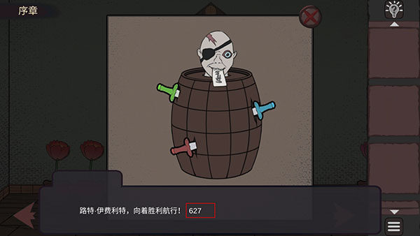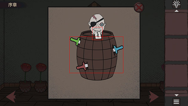 9、咱们回到有电视的那个初始场景,点旁边的酒桶。按照纸条上的颜色顺序,把三把剑插进去,从左到右依次是绿、红、蓝。插对之后,桶里那哥们儿会吐张纸条给你。