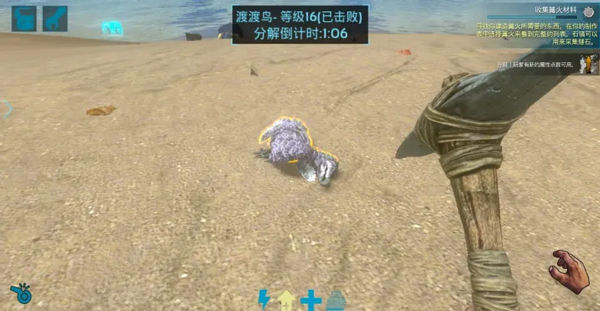 新手在收集材料的过程中,会遇到各式各样的生物,要学会区分、躲避或利用。渡渡鸟是新手常见生物之一,常出现于海岸、平原和森林。没有攻击性,你打它,它只会跑。所以渡渡鸟是新手练习【获得生肉】【驯化】【繁育】等技能的最佳选择。
