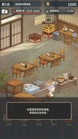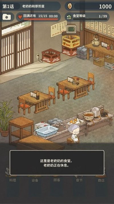 2.游戏刚开始的时候,会有新客人上门。由于初始的料理台上位置有限,你只能在饭团、海苔和鸡蛋这三种料理中选择两种来制作。游戏开始时,你会拥有1000金币和15点体力,店铺的等级是1级。