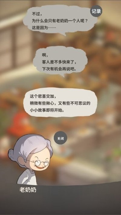 当所有客人都和老婆婆完成了全部对话,他们的满意度就会达到100%。这时候,老爷爷会出现,与老婆婆告别。他们已经结婚几十年了,离别时虽然万分不舍,但他们都坚信,老爷爷并没有真的离开,只是去了天上,在另一个地方继续守护着他们。