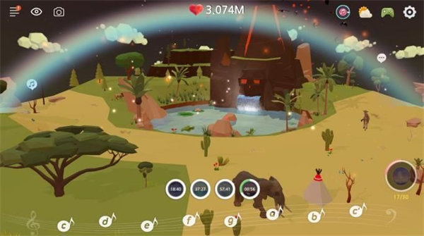 4、绿洲等级提升后,地形会肉眼可见地改变,新的树木和动物也会随之出现。通过弹奏音符,还能跟场景里的大部分东西互动。