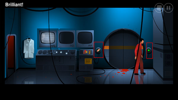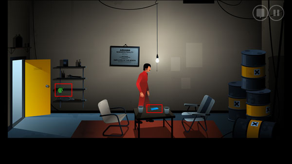 11、再次进入实验室最右边的房间,先用创可贴粘住左侧的按钮,再按一下右侧的按钮,即可把门打开。。