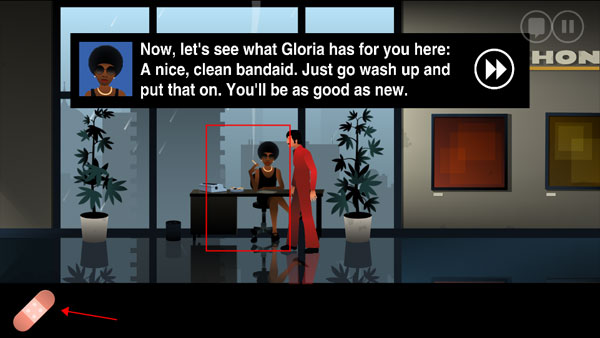 10、点一下那件白大褂,能拿到一张餐巾纸。用餐巾纸去擦右边地上的血迹。然后回到老板房间外面那个秘书那,跟她聊聊能换个创可贴。