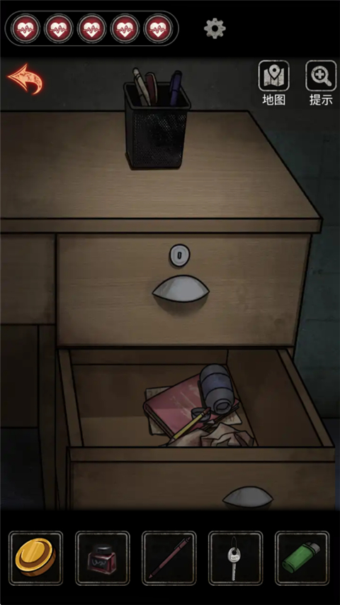 4、进了办公室,桌上的红墨水和笔都拿上,墙上还挂着一把钥匙,也别忘了。然后去点那个抽屉,多戳几下,打火机和小零件就到手了。