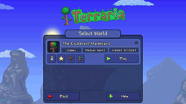 30.这场折磨人的开局选择总算快结束了!新创建的世界会被加到菜单的世界列表里。在世界选择列表里,选中你的世界,加载游戏。现在,是时候真正进入泰拉瑞亚的世界了!